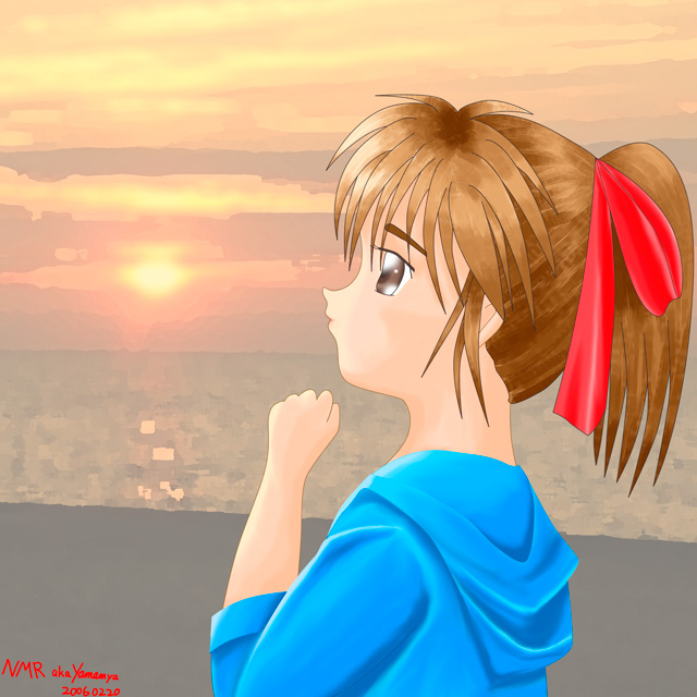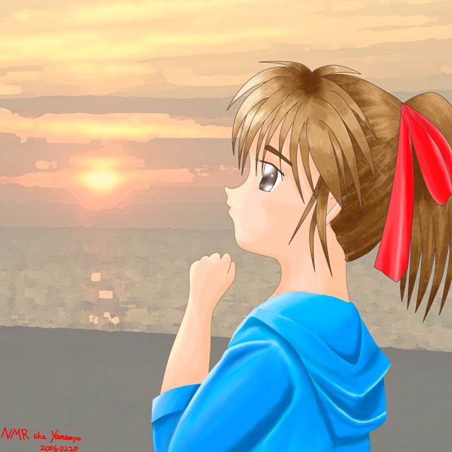 線画はPhotoshopのパスで、背景とレイヤー分けまでPhotoshopでやって、Painterに持って行って彩色という、まぁ、ボクのいつものパターンです。Painterではパステルメインで彩色してます。もちろんこすりまくりですが。Painterと言えば以前は水彩だったんですが、Painter6以降水彩はあきらめてます(ぉぃ) 髪の毛だけはペンツールを使ってますね。ちょっと荒くなってしまったかもしれません。